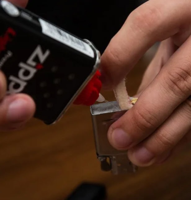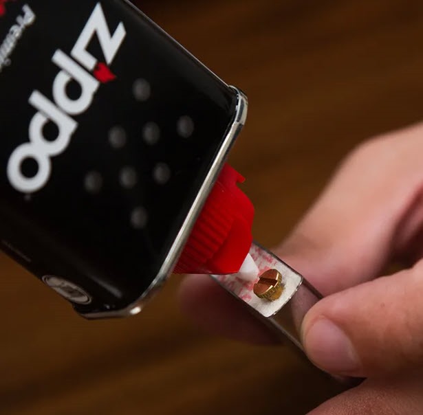 Медленно залейте небольшое количество бензина Zippo прямо на ватные вставки внутри корпуса зажигалки, предварительно отогнув угол фетровой вставки с обратной стороны винта (либо используйте специальное отверстие в ней). Таким образом, вы сможете контролировать поток жидкости и избежать проливания. Важно не переливать топливо! Избыток бензина может привести к утечке и образованию неприятного запаха.